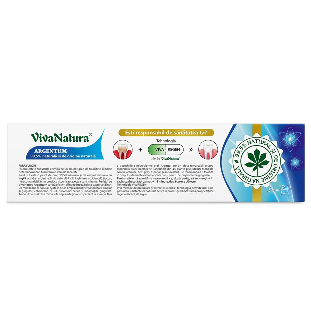 În plus, Argentum mai conține extracte din 23 de plante (rozmarin, cimbrișor, fenicul, cuișoare, scorțișoară, coada șoricelului, roiniță, busuioc, aloe vera), propolis și uleiuri vegetale, cum ar fi cele de mentă și salvie - toate acestea adăugând un plus de beneficii, având proprietăți antibacteriene și antiinflamatorii care ajută la calmarea gingiilor și la combaterea respirației urât mirositoare.