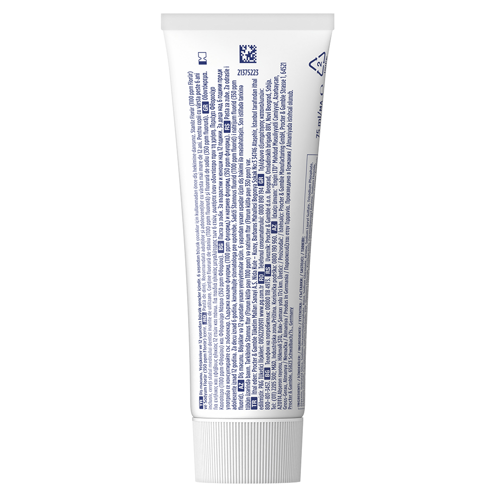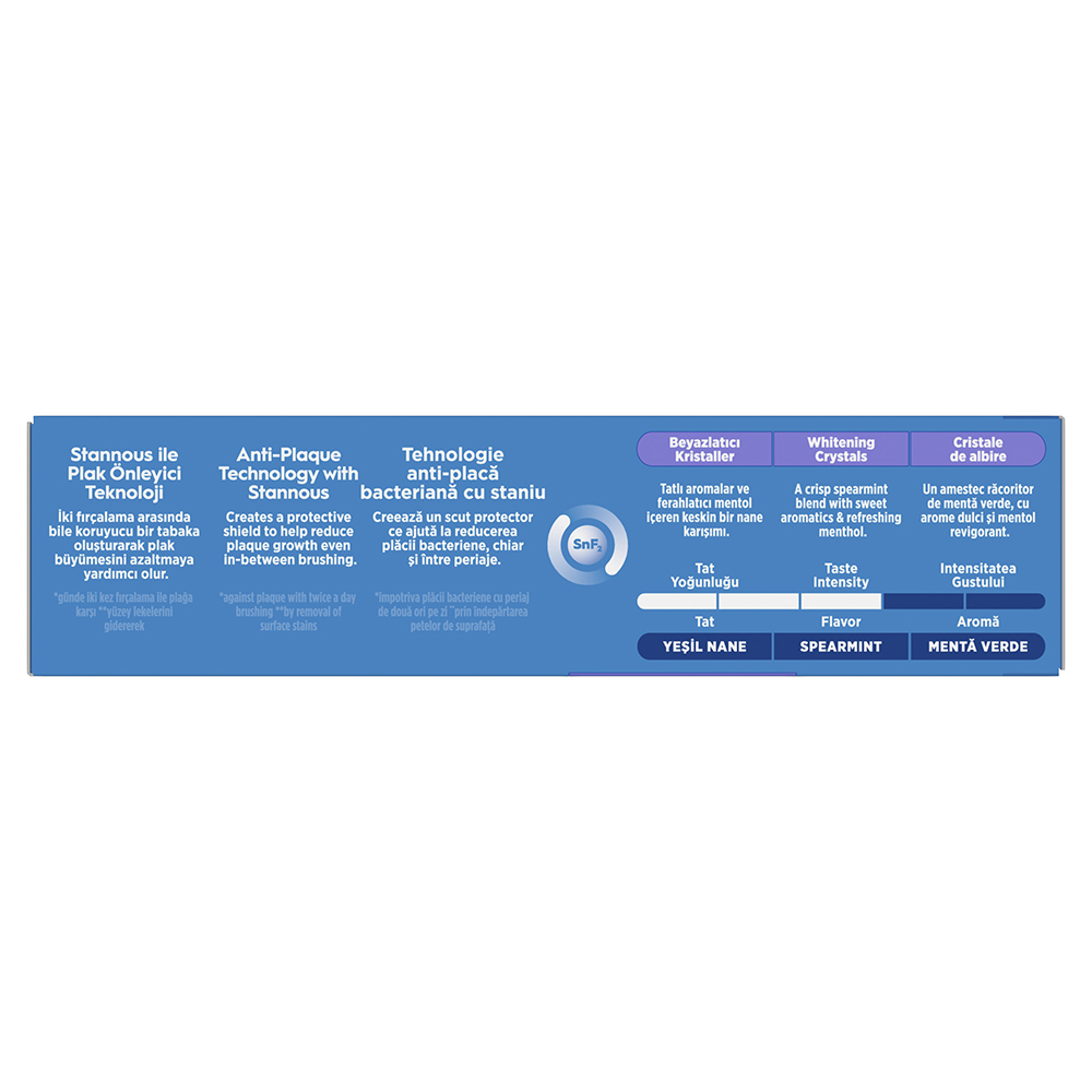 Ingrediente:Glycerin, Hydrated Silica, Sodium Hexametaphosphate, Aqua, Sodium Gluconate, Aroma, Sodium Lauryl Sulfate, Trisodium Phosphate, Stannous Fluoride, Carrageenan, Sodium Saccharin, PVP, Stannous Chloride, Xanthan Gum, Cocamidopropyl Betaine, Sodium Fluoride, Sodium Chloride, Sodium Hydroxide, Sodium Benzoate, CI 74260, CI 74160, Menthol, Mentha Viridis Leaf Oil, Limonene, Carvone, Anethole. Conţine fluorură de staniu (1100 ppm fluorură) şi fluorură de sodiu (350 ppm fluorură).