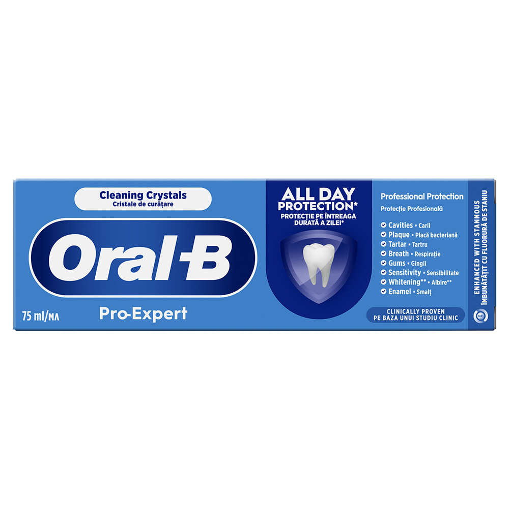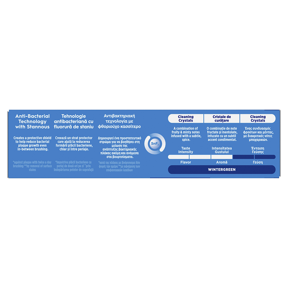 - ofera protectie pe tot parcursul zilei, atunci cand este utilizata de doua ori pe zi, tehnologia anti placa bacteriana cu Complexul de Fluor Stanos creeaza un scut de protectie pentru a ajuta la reducerea cresterii placii bacteriene chiar si intre periaje;