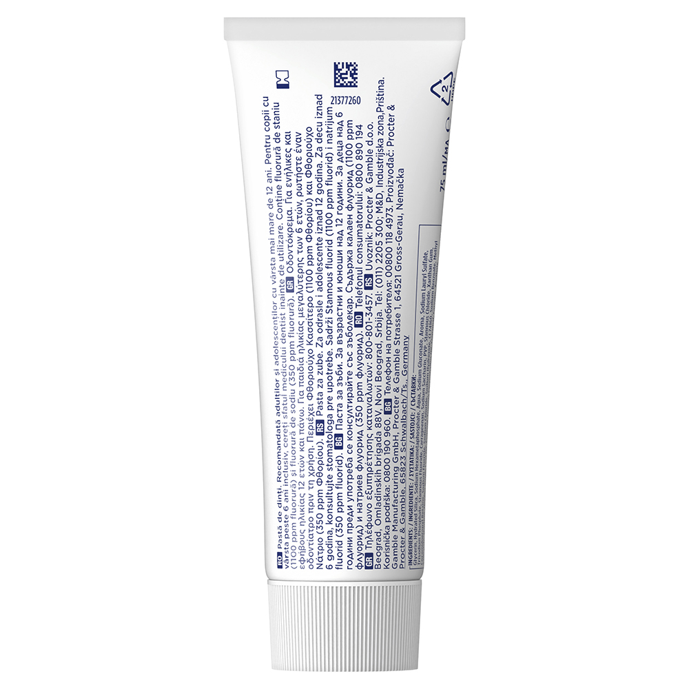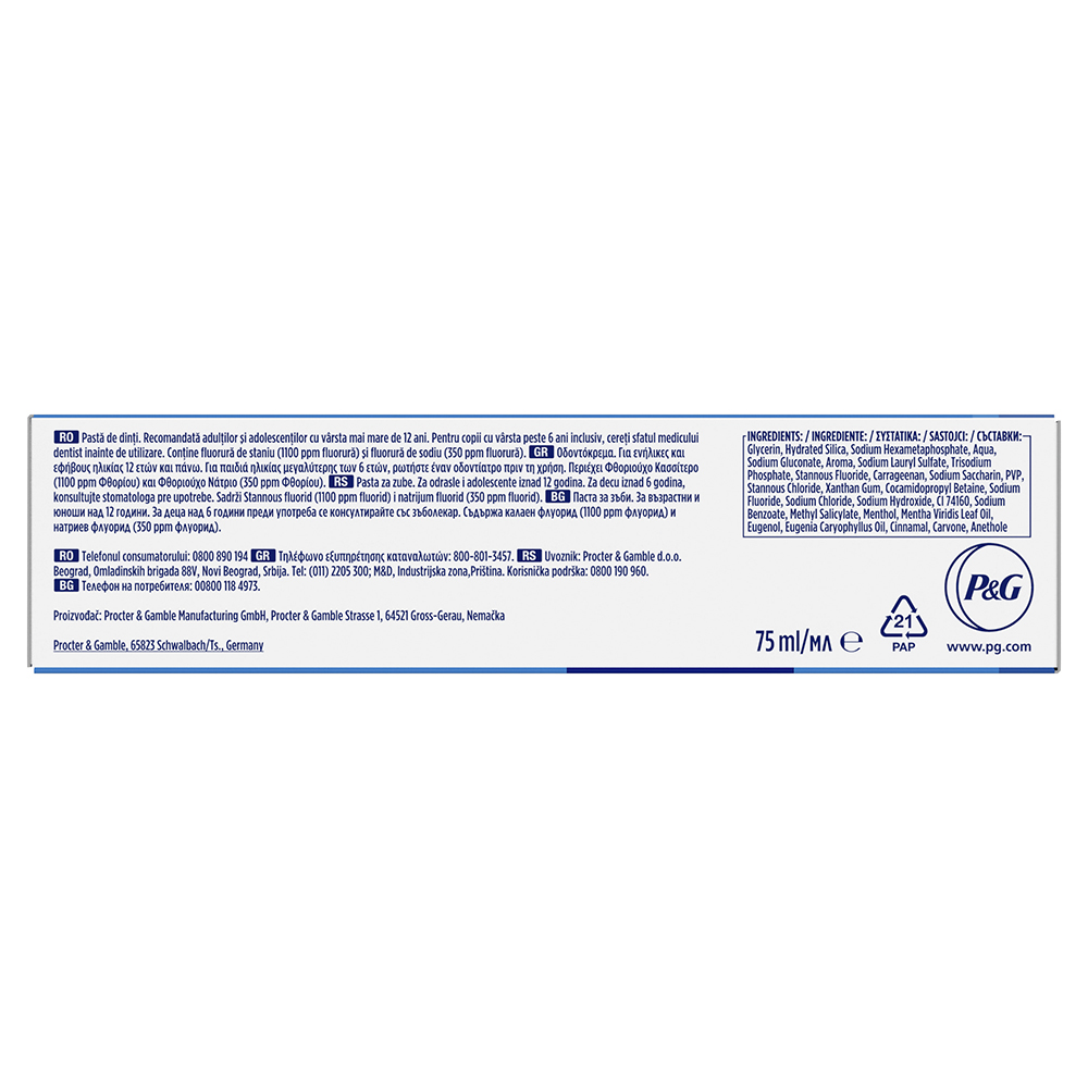 Glycerin, Hydrated Silica, Sodium Hexametaphosphate, Aqua, Sodium Gluconate, Aroma, Sodium Lauryl Sulfate, Trisodium Phosphate, Stannous Fluoride, Carrageenan, Sodium Saccharin, PVP, Stannous Chloride, Xanthan Gum, Cocamidopropyl Betaine, Sodium Fluoride, Sodium Chloride, Sodium Hydroxide, CI 74160, Sodium Benzoate, Methyl Salicylate, Menthol, Mentha Viridis Leaf Oil, Eugenol, Eugenia Caryophyllus Oil, Cinnamal, Carvone, Anethole. Conţine fluorură de staniu (1100 ppm fluorură) şi fluorură de sodiu (350 ppm fluorură).
