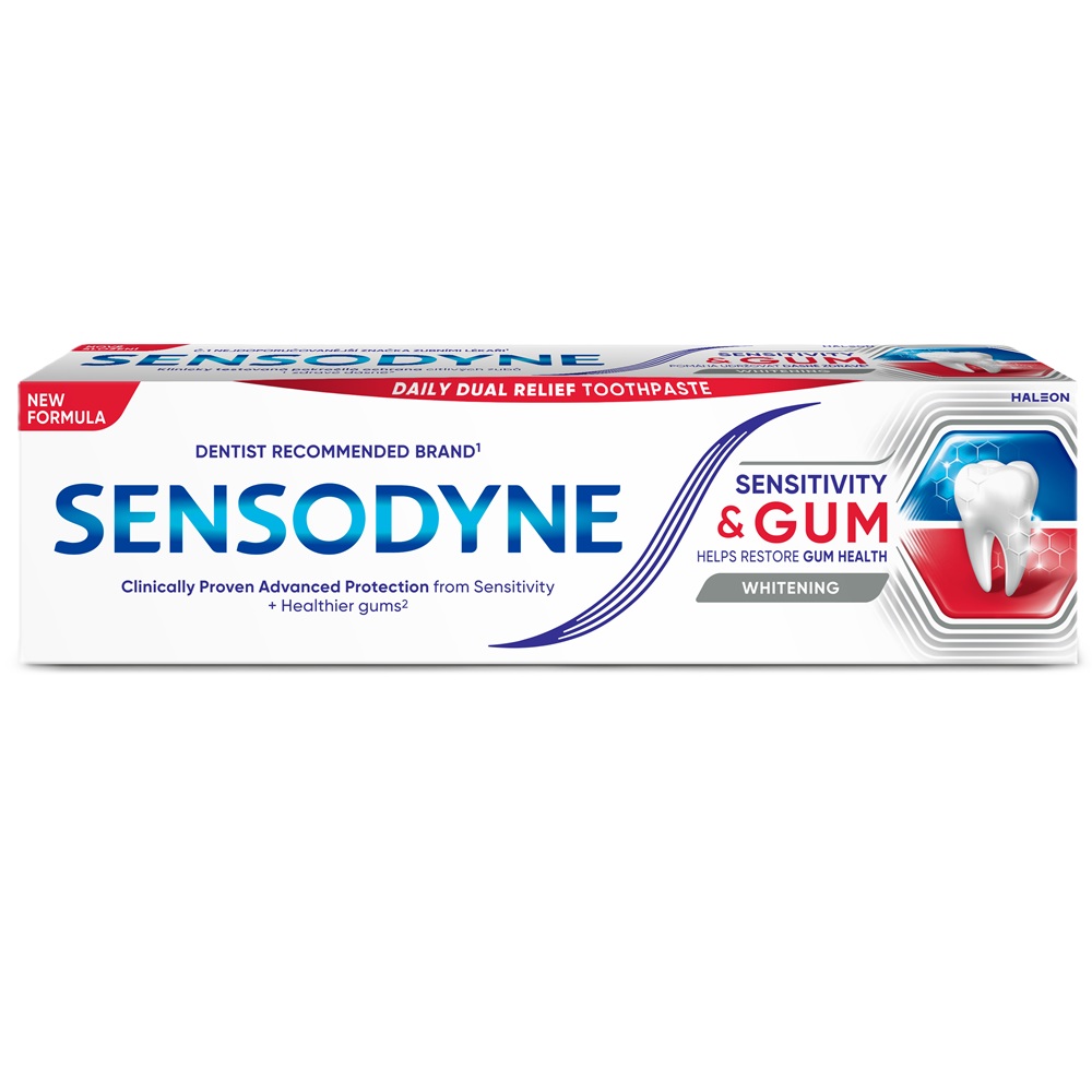 Este dovedit clinic ca pasta de dinti Sensodyne Sensitivity & Gum Whitening ofera protectie eficienta impotriva sensibilitatii dentare, imbunatateste sanatatea gingiilor si ajuta la indepartarea petelor pentru a mentine albul natural al dintilor*.
