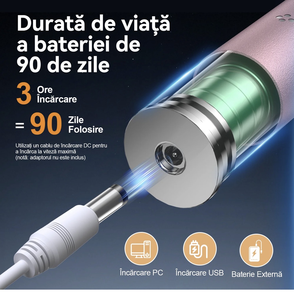 - incarcare prin cablu USB compatibil cu pc, baterii externe sau adaptoare(nu este inclus);