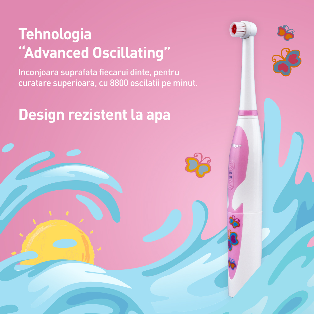 - dotata cu tehnologia “Advanced Oscillating” 8800 rotații pe minut, ajuta copilul dumneavoastra sa acopere toate zonele greu accesibile si sa respecte timpul de periaj recomandat de medicul dentist;