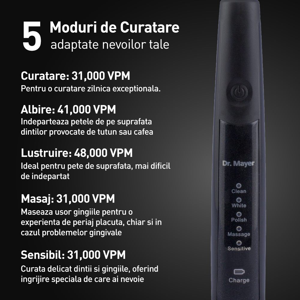 - cele 31.000 pana la 48.000 de vibratii sonice puternice va ofera ingrijire dentara completa si reduce foarte mult timpul de ingrijire dentara;