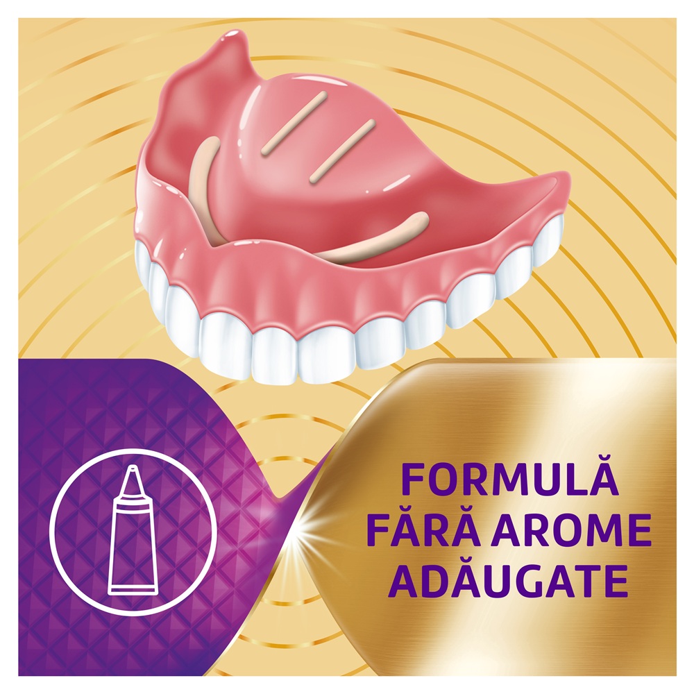 Produsul contine doi polimeri adezivi care isi maresc volumul in prezenta umiditatii. Astfel, se creeaza o structura etansa 3D intre proteza dentara si tesutul gingival. De asemenea, ajuta la impiedicarea patrunderii resturilor alimentare iritante sub proteza dentara.