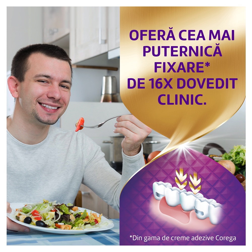 Este o crema adeziva care asigura acoperirea superioara* a suprafetei protezei dentare si fixarea ferma a acesteia. Noul aplicator este special conceput pentru o aplicare mai precisa a cremei adezive. Corega Max Sigilare este potrivita pentru toti purtatorii de proteze dentare totale sau partiale care nu doresc sa isi faca griji cu privire la patrunderea resturilor alimentare sub proteza dentara. Crema adeziva Corega Max Sigilare este conceputa pentru a sigila spatiul dintre proteza dentara si gingie, ajutand astfel la prevenirea patrunderii resturilor alimentare iritante sub proteza si ofera, in acelasi timp, o fixare solida si de durata a protezei dentare.