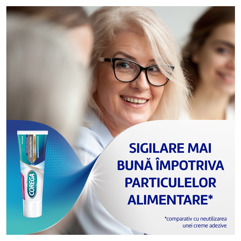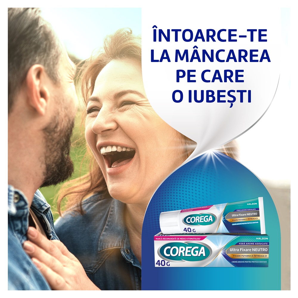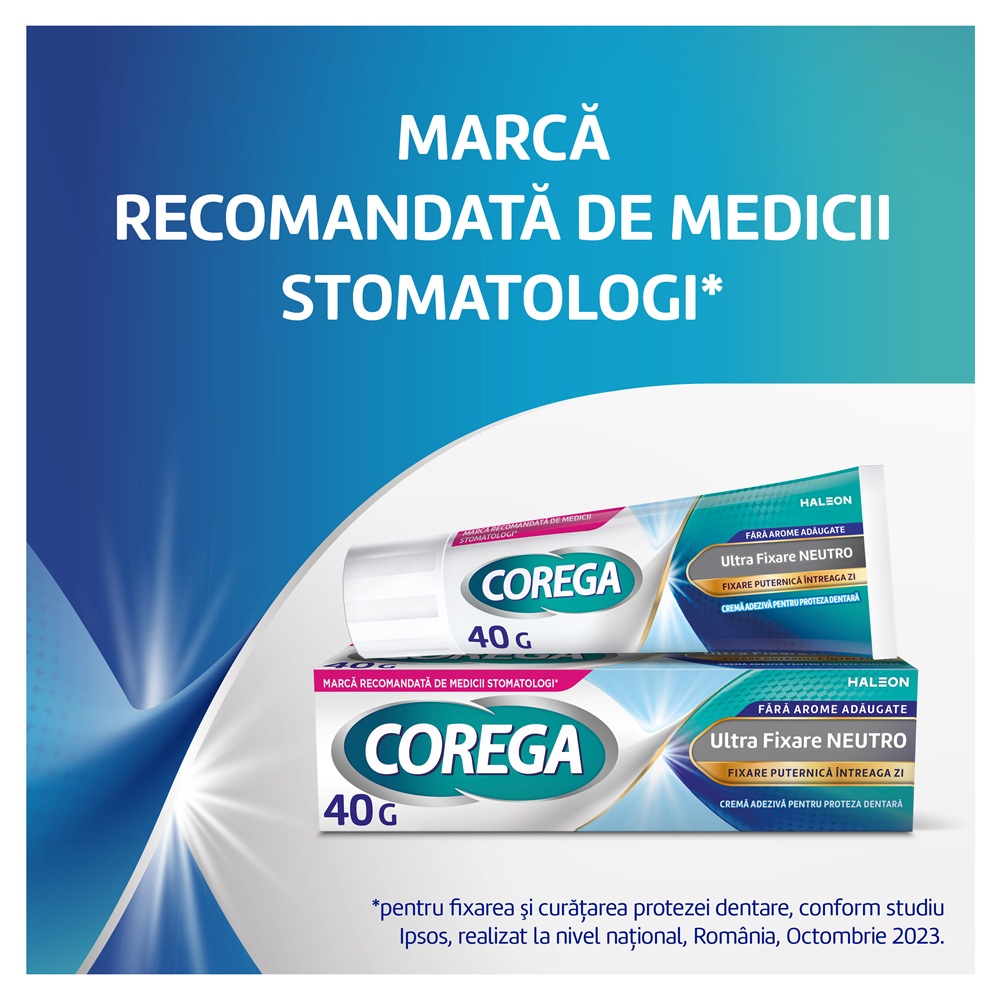 Corega Ultra Fixare Neutro este o crema adeziva care ofera fixarea protezei dentare. Aceasta nu contine arome sau coloranti artificiali. Daca esti purtator de proteza dentara totala sau partiala si iti doresti fixarea ferma a acesteia pe parcursul intregii zile, crema adeziva Corega Ultra Fixare Neutro este potrivita pentru tine.