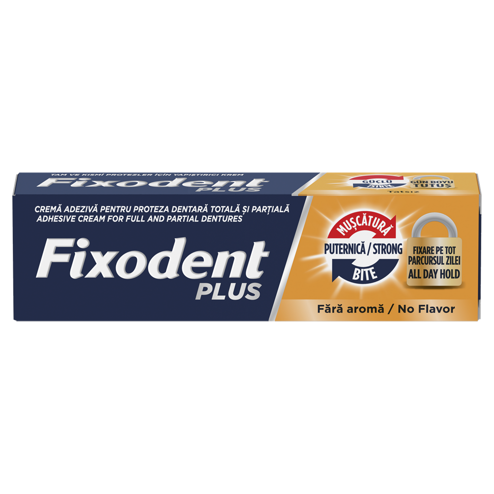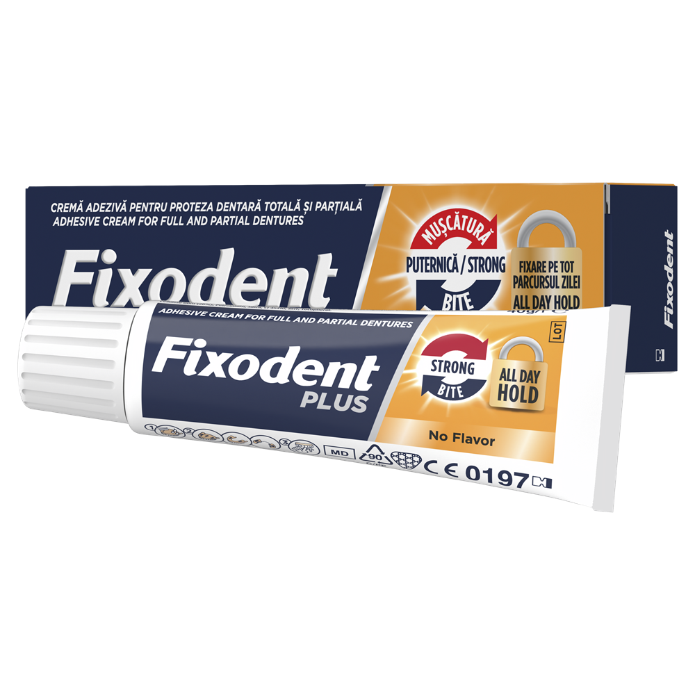 - fixeaza pentru a va mentine proteza dentara in pozitie atunci cand muscati;