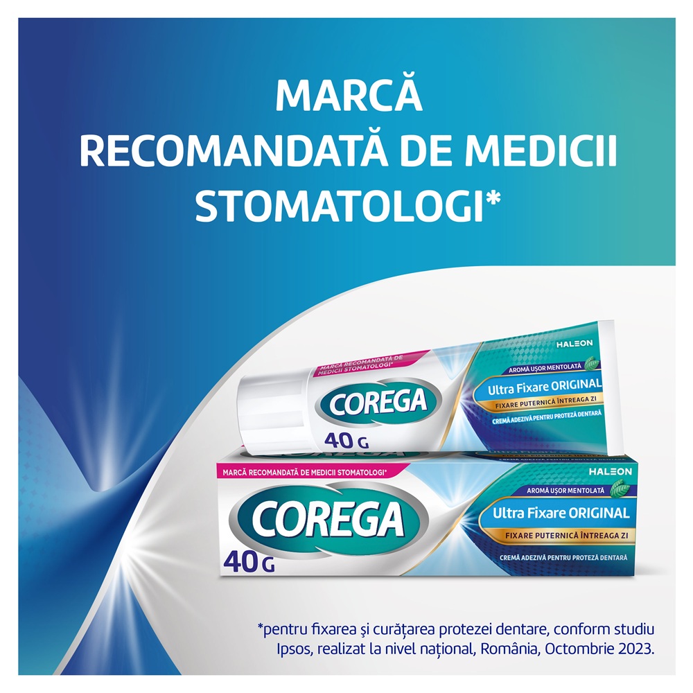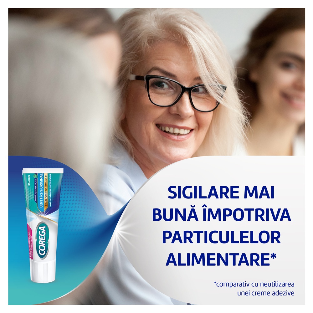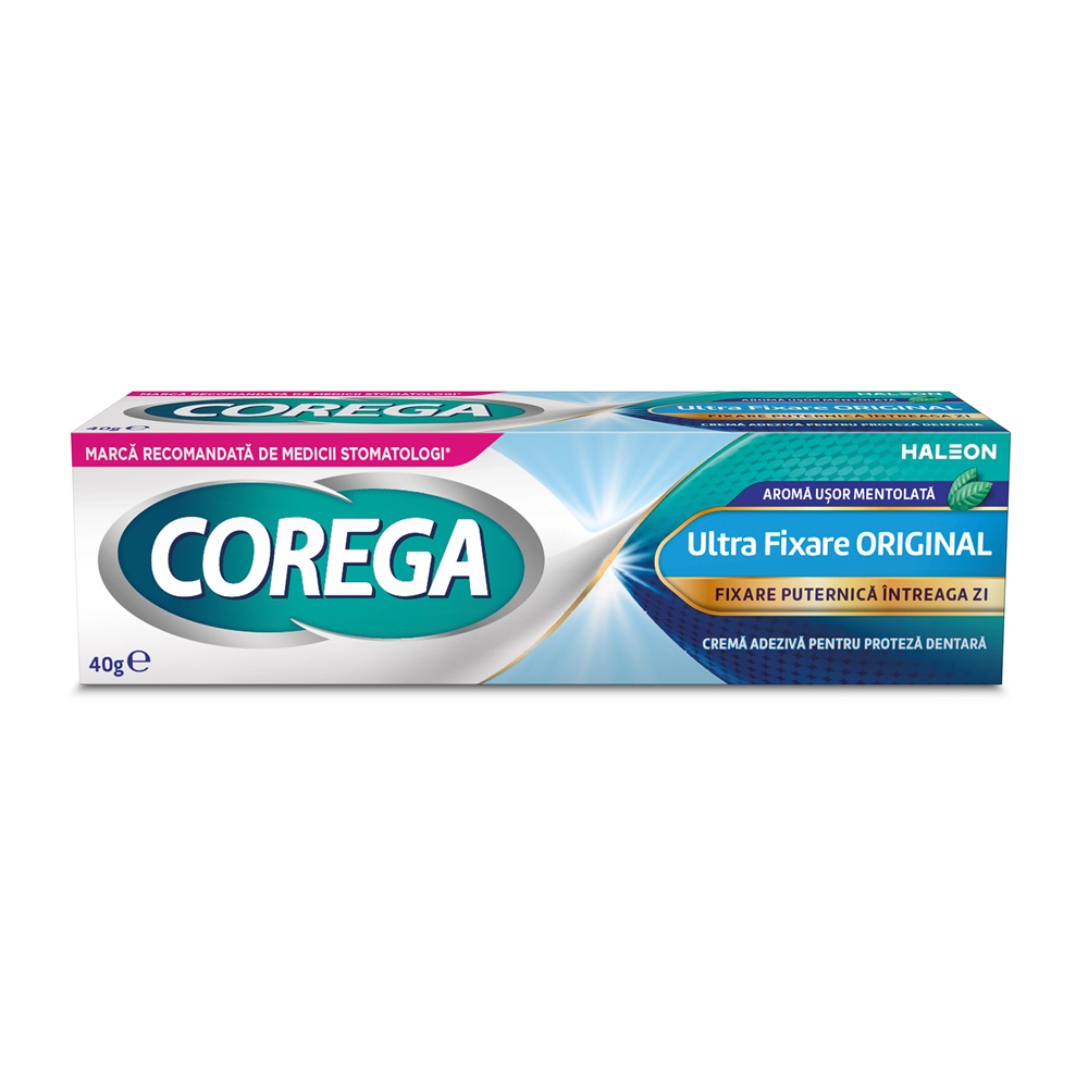 - crema adeziva Corega Ultra Fixare Original ofera fixarea ferma a protezei dentare timp de 12 ore, si ajuta la impiedicarea patrunderii resturilor alimentare iritante sub aceasta;