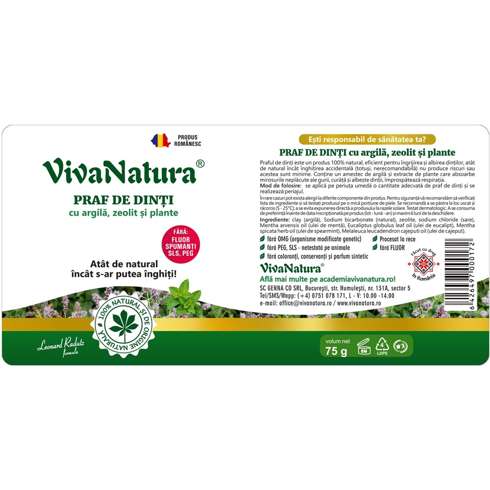 - nu contine fluor, parabeni, OMG (organisme modificate genetic), PEG, SLS, coloranți, conservanți și parfum sintetic;