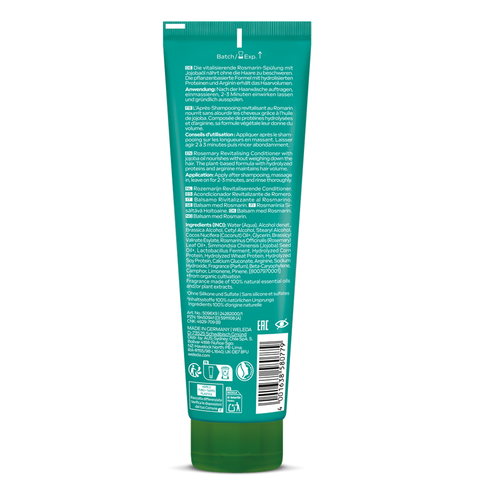 Apa (Aqua), alcool denat, Brassica Alcohol, Cetyl Alcohol, Stearyl Alcohol, Cocos Nucifera (Coconut) Oil+, Glycerin, Brassicyl Valinate Esylate, Rosmarinus Officinalis (Rosemary) Leaf Oil+, Simmondsia Chinensis (Jojoba) Seed Oil+, Lactobacillus Ferment, Proteina hidrolizata de porumb, Proteina hidrolizata de grau, Proteina hidrolizata de soia, Gluconat de calciu, Arginina, Hidroxid de sodiu, Parfum (Parfum), Beta Cariofilen, Camfor, Limonen, Pinen. +din culturi ecologice.