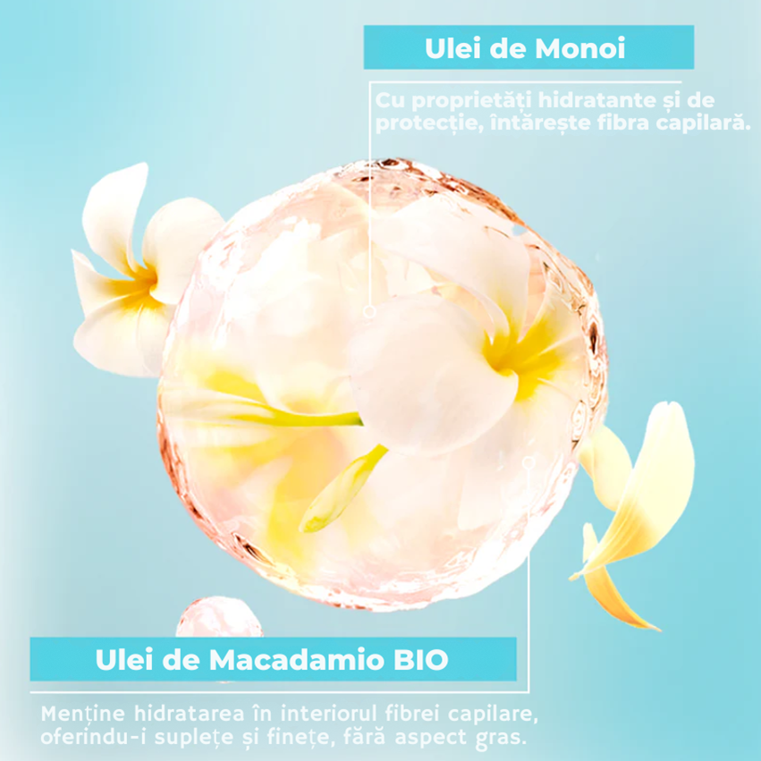 - textura cremoasa imbogatita cu ulei organic de macadamia si ulei de monoi patrunde rapid in fibra capilara, oferind hidratare intensa si hranire profunda fara a lasa reziduuri grase;