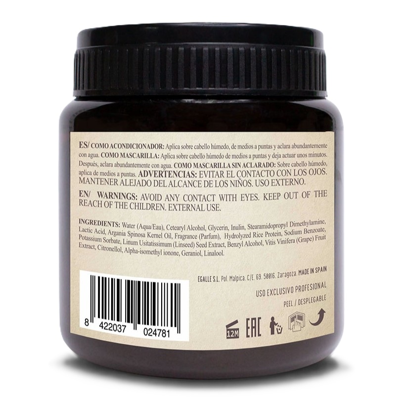 Water (Aqua/Eau), Cetearyl Alcohol, Glycerin, Inulin, Stearamidopropyl Dimethylamine, Lactic Acid, Argania Spinosa Kernel Oil, Fragrance (Parfum), Hydrolyzed Rice Protein, Sodium Benzoate, Potassium Sorbate, Linum Usitatissimum (Linseed) Seed Extract, Benzyl Alcohol, Vitis Vinifera (Grape) Fruit Extract, Citronellol, Alpha-isomethyl ionone, Geraniol, Linalool.