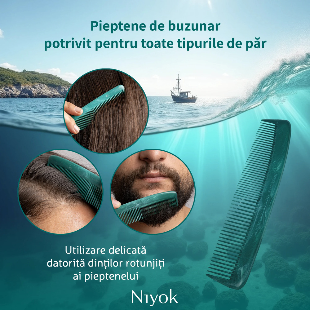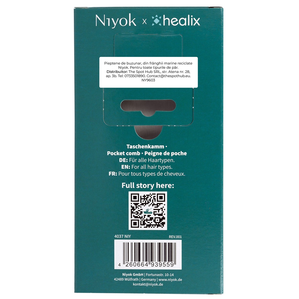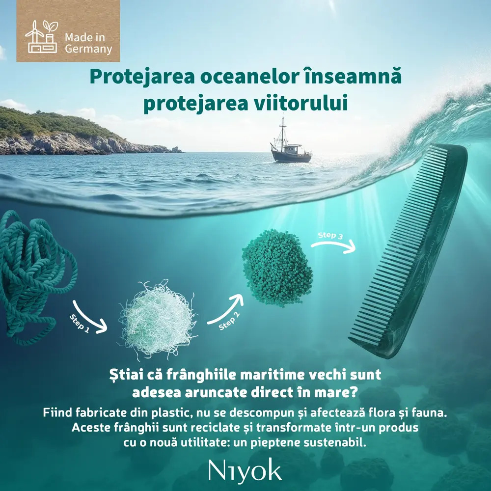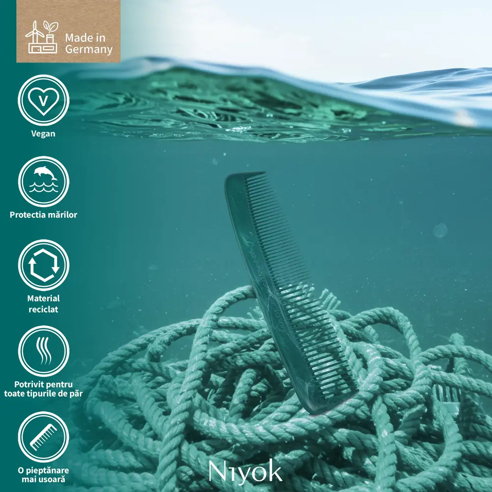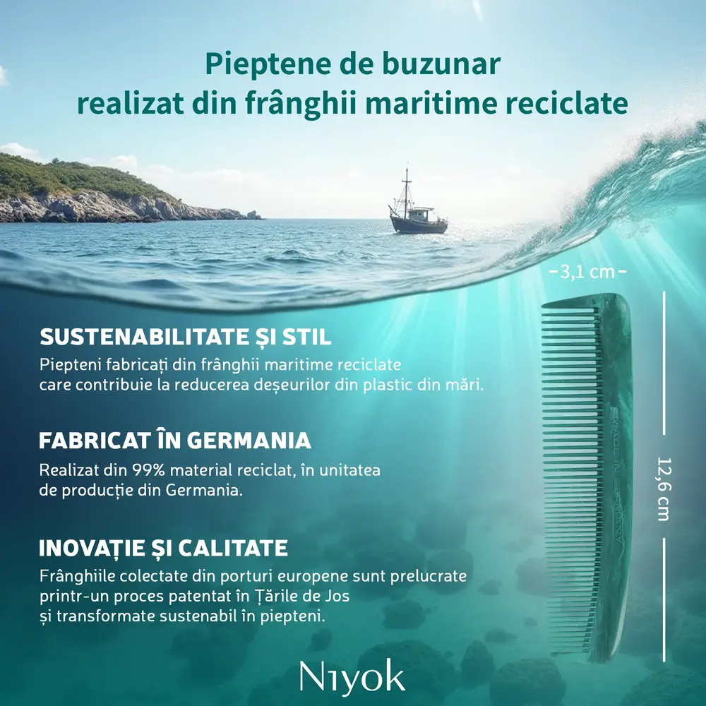 - fabricat in Germania din 99% franghii maritime reciclate, acest pieptan combina minimalismul functional cu responsabilitatea ecologica, datorita colaborarii Niyok x Healix - compania europeana care transforma franghiile maritime uzate in materiale premium complet trasabile;