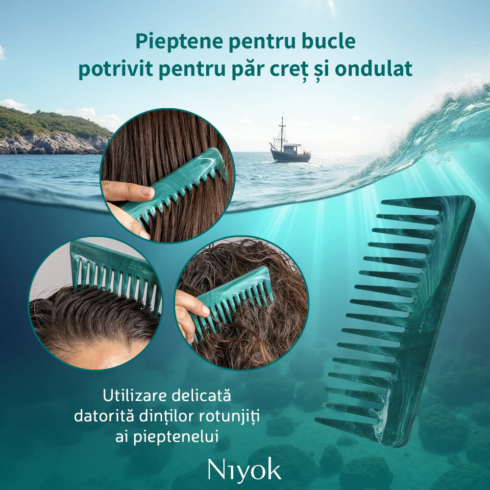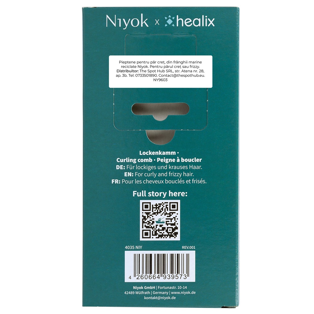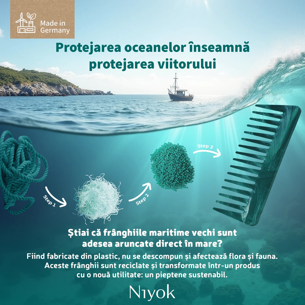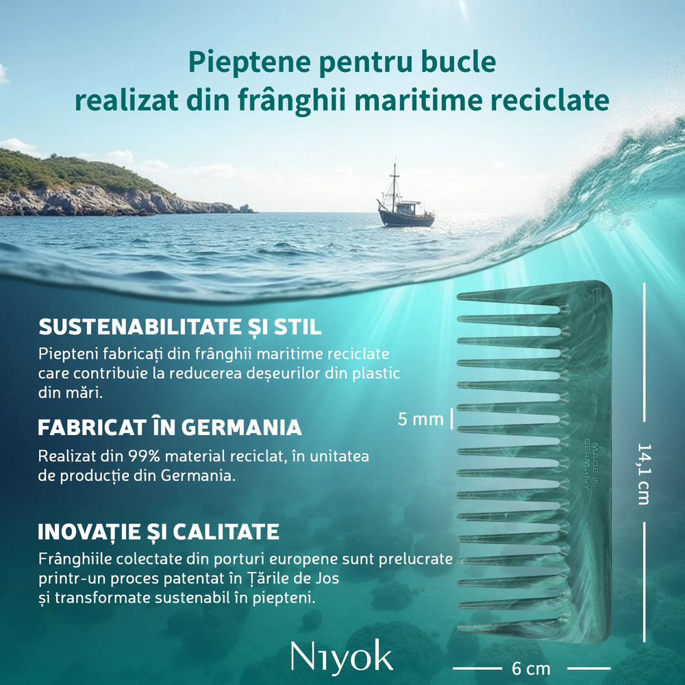- fabricat in Germania din 99% franghii maritime reciclate, acest pieptan combina designul ergonomic Niyok cu tehnologia Healix - compania europeana care colecteaza franghii uzate din porturi, le transforma in granule si le readuce in circuit ca materiale premium si sustenabile;