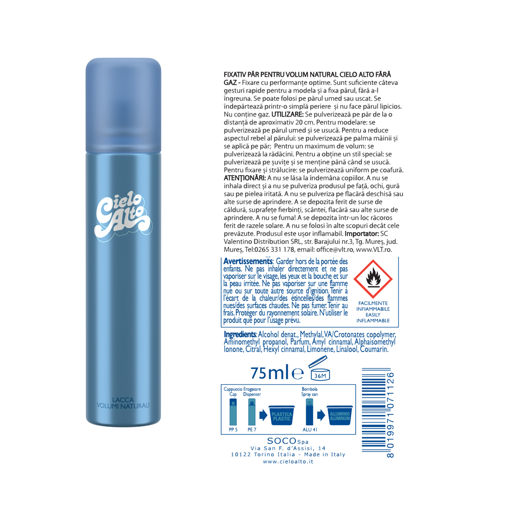 Alcohol denat, Methylal, VA/Crotonates copolymer, Aminomehtyl propanol, Parfum, Amyl cinnamal, Alpha-isomethyl ionone, Citral, Hexyl cinnamal, Limonene, Linalool, Coumarin.