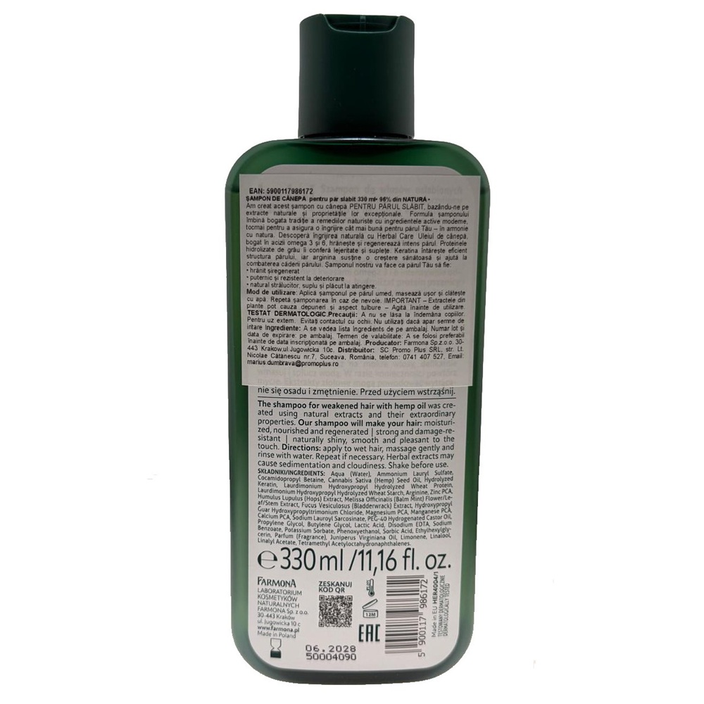 Aqua (Water), Ammonium Lauryl Sulfate, Cocamidopropyl Betaine, Cannabis Sativa (Hemp) Seed Oil, Hydrolyzed Keratin, Laurdimonium Hydroxypropyl Hydrolyzed Wheat Protein, Laurdimonium Hydroxypropyl Hydrolyzed Wheat Starch, Arginine, Zinc PCA, Humulus Lupulus (Hops) Extract, Melissa Officinalis (Balm Mint) Flower/Leaf/Stem Extract, Fucus Vesiculosus (Bladderwrack) Extract, Hydroxypropyl Guar Hydroxypropyltrimonium Chloride, Magnesium PCA, Manganese PCA, Calcium PCA, Sodium Lauroyl Sarcosinate, PEG-40 Hydrogenated Castor Oil, Propylene Glycol, Butylene Glycol, Lactic Acid, Disodium EDTA, Sodium Benzoate, Potassium Sorbate, Phenoxyethanol, Sorbic Acid, Ethylhexylglycerin, Parfum (Fragrance), Juniperus Virginiana Oil, Limonene, Linalool, Linalyl Acetate, Tetramethyl Acetyloctahydronaphthalenes.