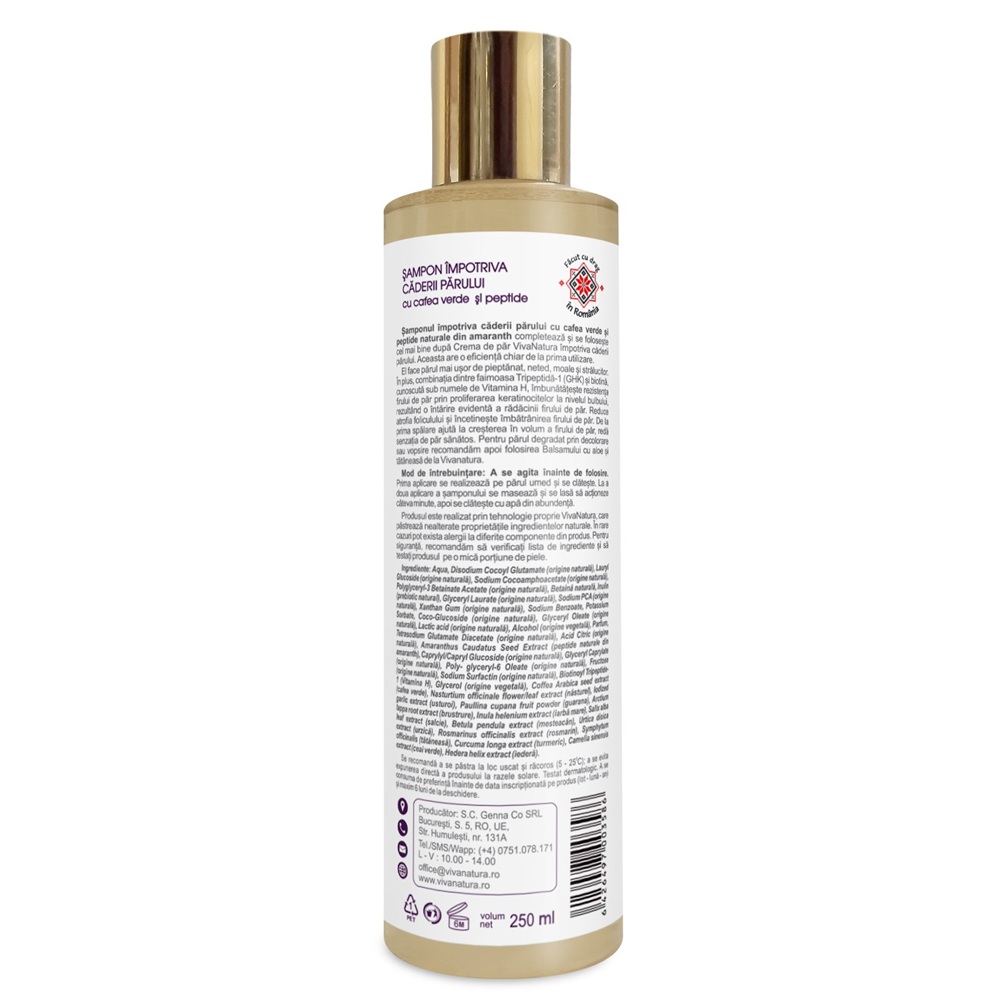 Aqua, Disodium Cocoyl Glutamate(origine naturala), Lauryl Glucoside(origine naturala), Sodium Cocoamphoacetate(origine naturala), Polyglyceryl-3 Betainate Acetate(origine naturala), Betaina naturala, Inulin(prebiotic natural), Glyceryl Laurate (origine naturala), Sodium PCA(origine naturala), Xanthan Gum(origine naturala), Sodium Benzoate, Potassium Sorbate, Coco-Glucoside(origine naturala), Glyceryl Oleate(origine naturala), Lactic acid(origine naturala), Alcohol(origine vegetala), Parfum, Tetrasodium Glutamate Diacetate(origine naturala), Acid Citric(origine naturala), Amaranthus Caudatus Seed Extract(peptide naturale din amaranth), Caprylyl/Capryl Glucoside(origine naturala), Glyceryl Caprylate(origine naturala), Poly- glyceryl-6 Oleate(origine naturala), Fructose(origine naturala), Sodium Surfactin(origine naturala), Biotinoyl Tripeptide-1(Vitamina H), Glycerol(origine vegetala), Coffea Arabica seed extract(cafea verde), Nasturtium officinale flower/leaf extract (nasturel), Iodized garlic extract(usturoi), Paullina cupana fruit powder(guarana), Arctium lappa root extract(brustrure), Inula helenium extract(iarbă mare), Salix alba leaf extract(salcie), Betula pendula extract(mesteacăn), Urtica dioica extract(urzică), Rosmarinus officinalis extract(rosmarin),Symphytum officinalis(tătăneasă), Curcuma longa extract(turmeric), Camelia sinensis extract(ceai verde), Hedera helix extract(iedera).