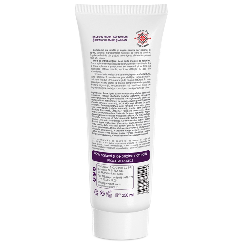 Aqua (apa), Lauryl Glucoside(origine naturala), Squalane, Sodium Surfactin (origine naturala), Disodium cocoil glutamate (origine naturala), Coco-glucoside, Sapindus mukorosi fruit extract (nuci de sapun), Hydrolyzed Vegetable Protein (origine naturala), PCA Glyceryl Oleate (origine naturala), Dehydroxanthan gum (origine naturala), Coco-Caprylate/Caprate (origine naturala), Lactic acid (natural), Sodium Benzoate, Alcohol (origine naturala), Guar Hydroxypopryltrimonium Chloride (origine naturala), Argan Aquasil (origine naturala), Potasium Sorbate, Parfum, Melissa Officinalis leaf/ seed oil (ulei de roinita), Citrus limon oil (ulei lamaie), Citric acid (acid citric), Aloe vera callus extract (aloe), Arctium lappa root extract (brusture), Inula helenium extract (iarba mare), Salix alba leaf extract (salcie), Betula pendula extract (mesteacan), Urtica dioica extract (urzica), Symphytum officinalis (tataneasa), Curcuma longa extract (turmeric), Coffea arabica seed extract (cafea verde), Paullinia cupana fruit powder (guarana), Camelia sinensis extract (ceai verde).