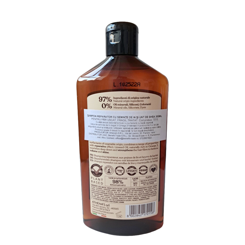 Ingrediente:Aqua [Water], Sodium coceth sulfate, Lauryl glucoside, Cocamidopropyl betaine, Sodium olivoyl glutamate, Potassium lauroyl wheat amino acids, Butyrospermum parkii (Shea) butter, Linum usitatissimum (Linseed) seed oil (*), Hydrolyzed rice protein, Panthenol, Guar hydroxypropyltrimonium chloride, Polyquaternium-47, Citric acid, Sodium gluconate, Maris sal, Parfum [Fragrance], Benzoic acid, Polysorbate 20, Dehydroacetic acid, PEG-40 hydrogenated castor oil, Linalool, Linalyl acetate, Coumarin, Trideceth-9, Hexyl cinnamal, Limonene, PEG-7 glyceryl cocoate, Benzyl salicylate, PEG-200 hydrogenated glyceryl palmate, Phenoxyethanol.