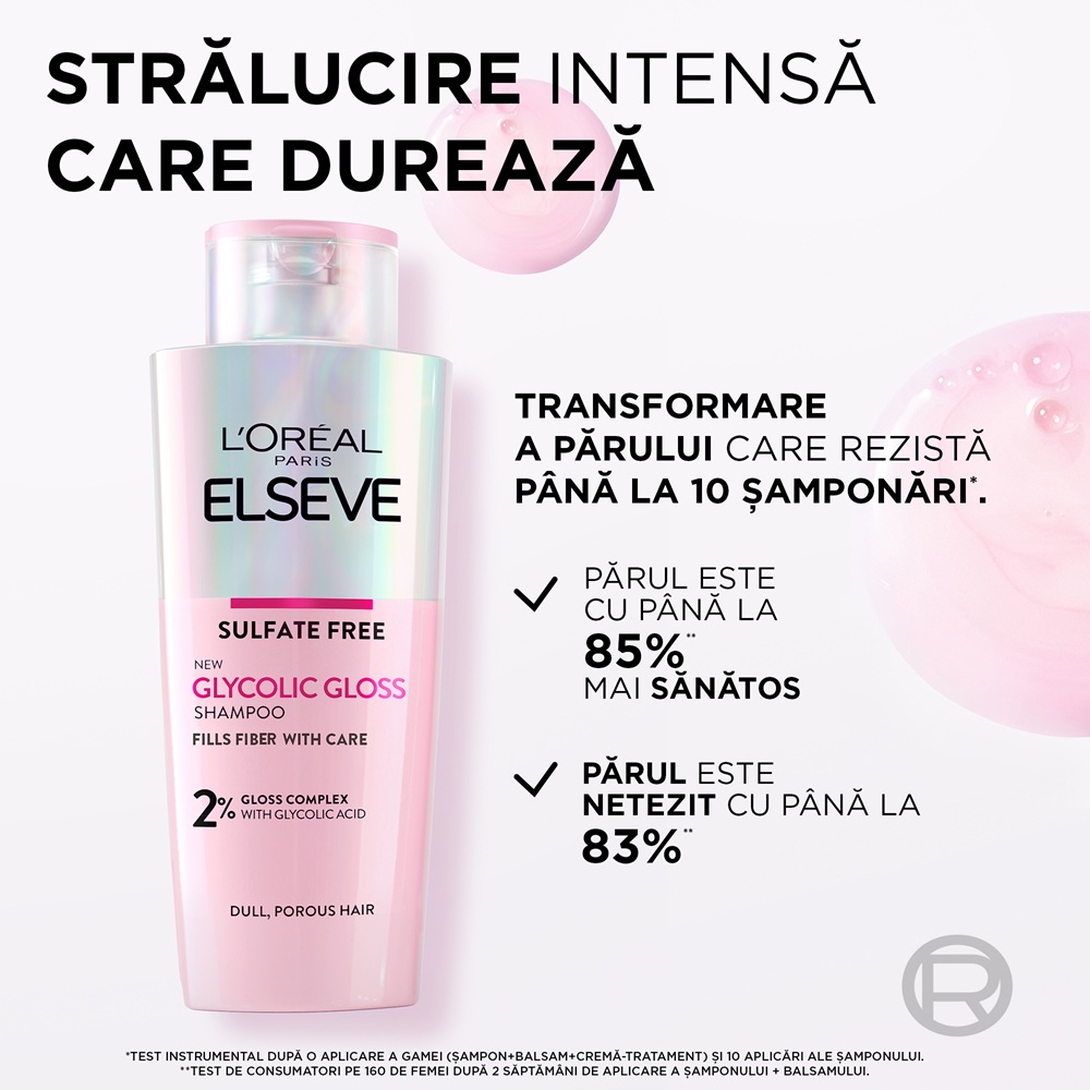 - este imbogatit cu 2% [COMPLEX DE STRALUCIRE] cu Acid Glicolic: fibra este restaurata din interior pentru a imbunatati calitatea parului;