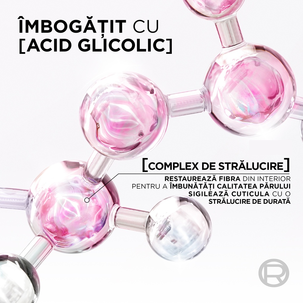- este imbogatit cu 11% [COMPLEX DE STRALUCIRE] cu Acid Glicolic: fibra este restaurata din interior pentru a imbunatati calitatea parului, oferindu-i o stralucire de durata;