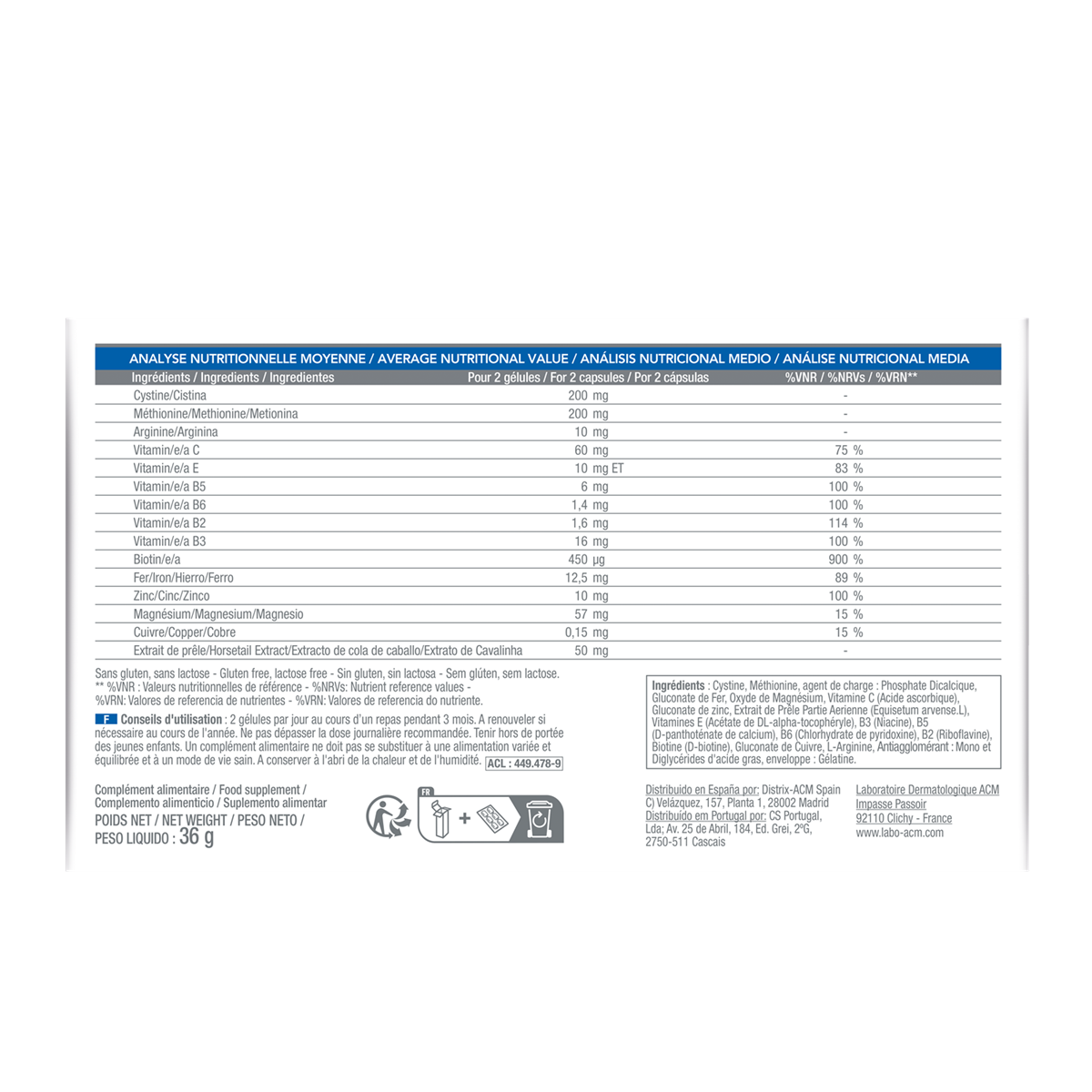 Ingrediente:Cistină, metionină, capsulă: hipromeloză, colorant/clorofilină de cupru-sodică; agent de încărcare: fosfat dicalcic dihidrat; gluconat de fier; oxid de magneziu; vitamina C/acid ascorbic; gluconat de zinc; extract apos 2-4:1 (maltodextrină, dioxid de siliciu) din paărți aeriene de Coada-calului (Equisetum arvense), cu 7% siliciu; vitamina E/DL-alfa acetat de tocoferil; vitamina B3/niacină, arginină; agent antiaglomerant: mono ‑i digliceride ale acizilor gra‑i; vitamina B5/acid pantotenic; vitamina B6/clorhidrat de piridoxină; vitamina B2/riboflavină; gluconat de cupru; biotină.