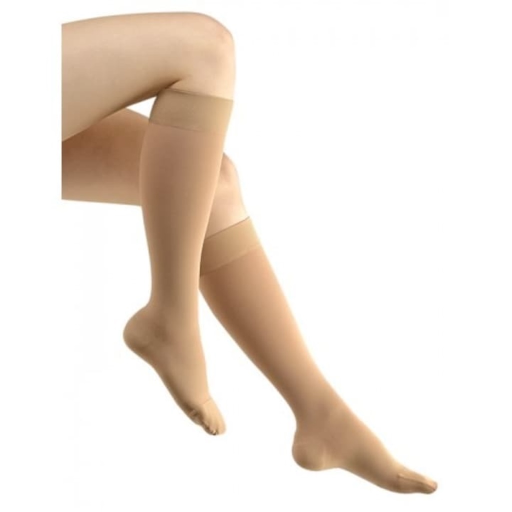 - nivelul de compresie de 10–17 mmHg ofera o presiune usoara si confortabila, mai ridicata la nivelul gleznei si progresiv mai redusa spre genunchi, putand contribui la imbunatatirea fluxului venos si la reducerea disconfortului;