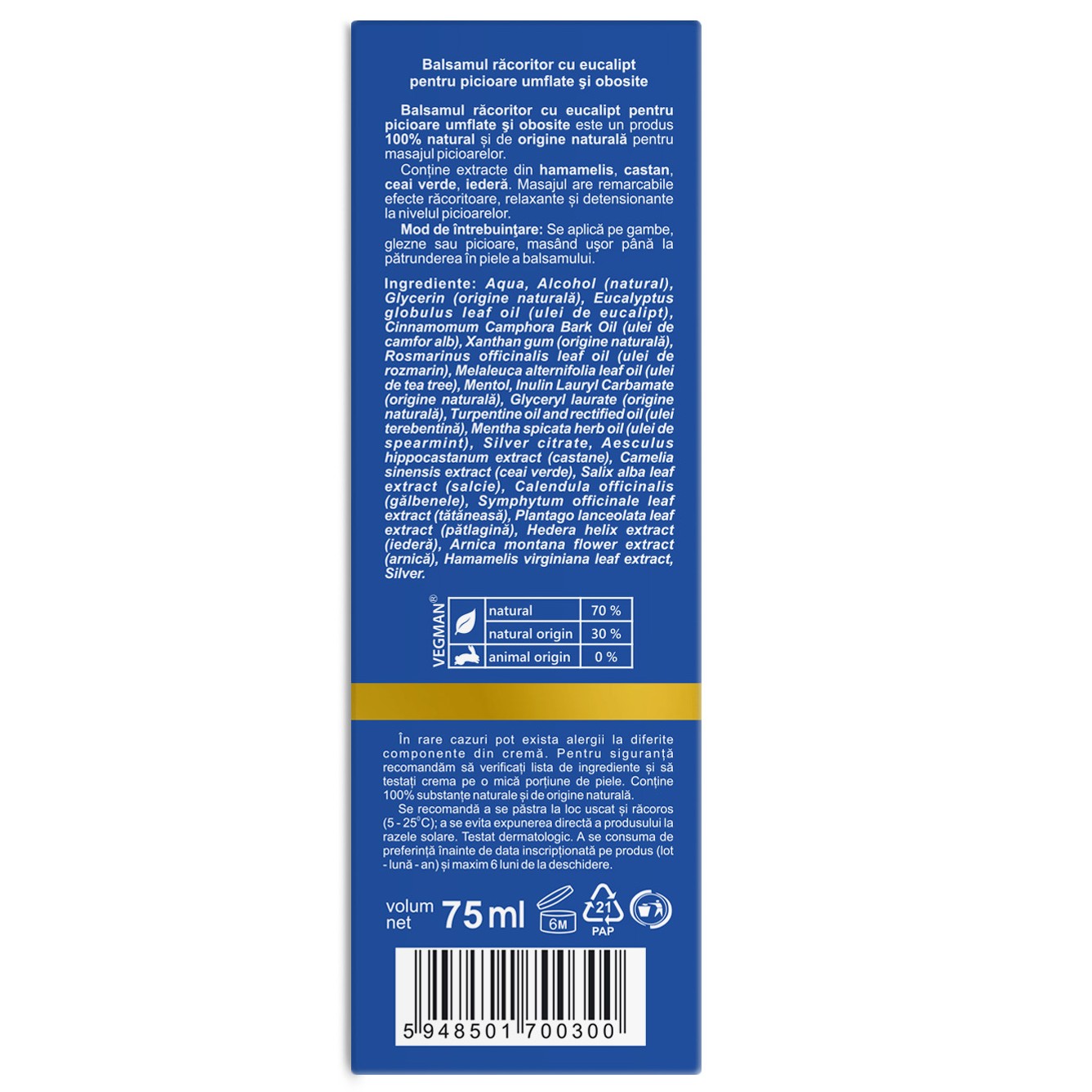 - masajul cu balsamul de eucalipt are remarcabile efecte răcoritoare, relaxante și detensionante la nivelul picioarelor;