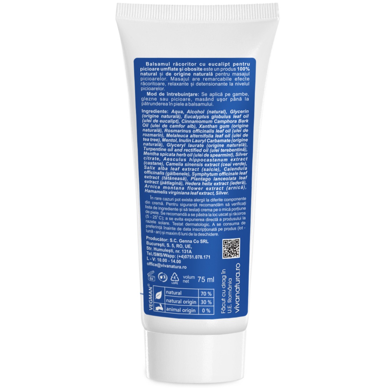 Aqua (apă), Alcohol, Cinnamomum camphora leaf oil (camfor), Eucalyptus globulus leaf oil (ulei de eucalipt), Turpentine oil (extract natural din Pinus sp.), Xanthan-gum (natural), Mentha piperita oil (ulei de mentă), Rosmarinus officinalis leaf oil (ulei de rozmarin), Colloidal Silver (argint), Aesculus hippocastanum extract (castane), Cyamopsis tetragonoloba gum (gumă guar), Glyceryl stearate citrate (origine naturală), Camelia sinensis extract (ceai verde), Salix alba leaf extract (salcie), Calendula officinalis (gălbenele), Symphytum officinale leaf extract (tătăneasă), Plantago lanceolata leaf extract (pătlagină), Hedera helix extract (iederă), Arnica montana flower extract (arnică), Hamamelis virginiana leaf extract, Citric acid (origine naturală).