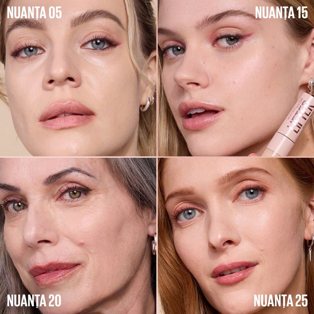 Aplicati in zona ochilor sau pe zonele cu imperfectiuni, folosind buretelul aplicator sau tapotand usor cu degetele. Textura tip serum permite estompare usoara si un efect natural, fiind potrivit atat pentru corectarea zonelor din jurul ochilor, cat si pentru retusuri rapide.