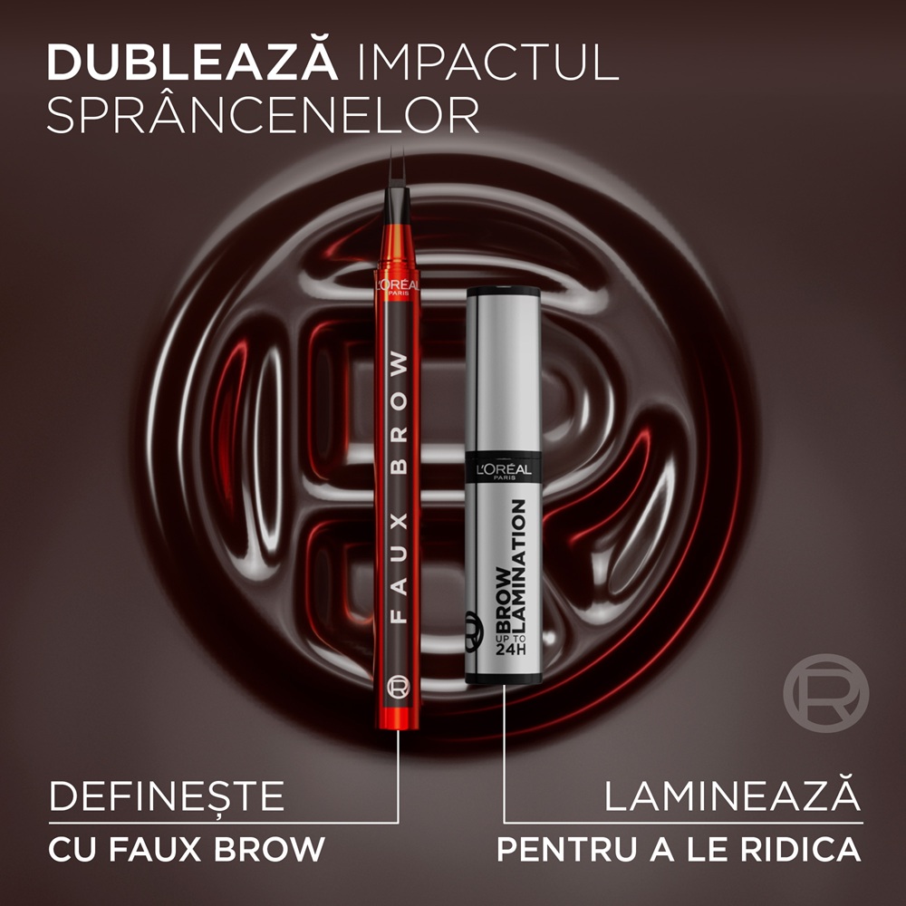 1. Ridicati si setati (optional): pentru un aspect sculptat, periati sprancenele ascendent folosind Loreal Paris Infaillible Brow Lamination (vandut separat).