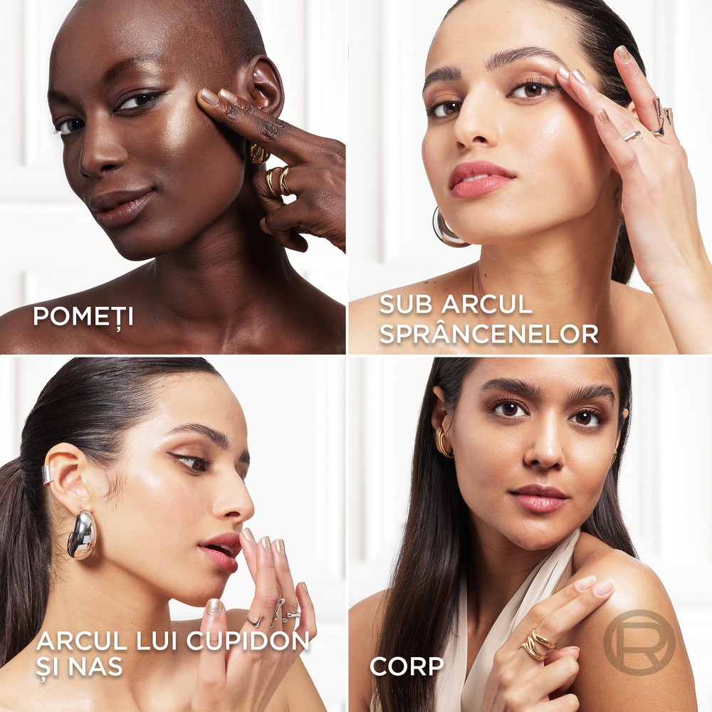 Produsul poate fi aplicat pe ten in zonele care reflecta lumina: pometi, sub arcul sprancenelor, deasupra arcului lui Cupidon si pe podul nasului. Aplica produsul si pe corp, pentru un efect de stralucire complet.