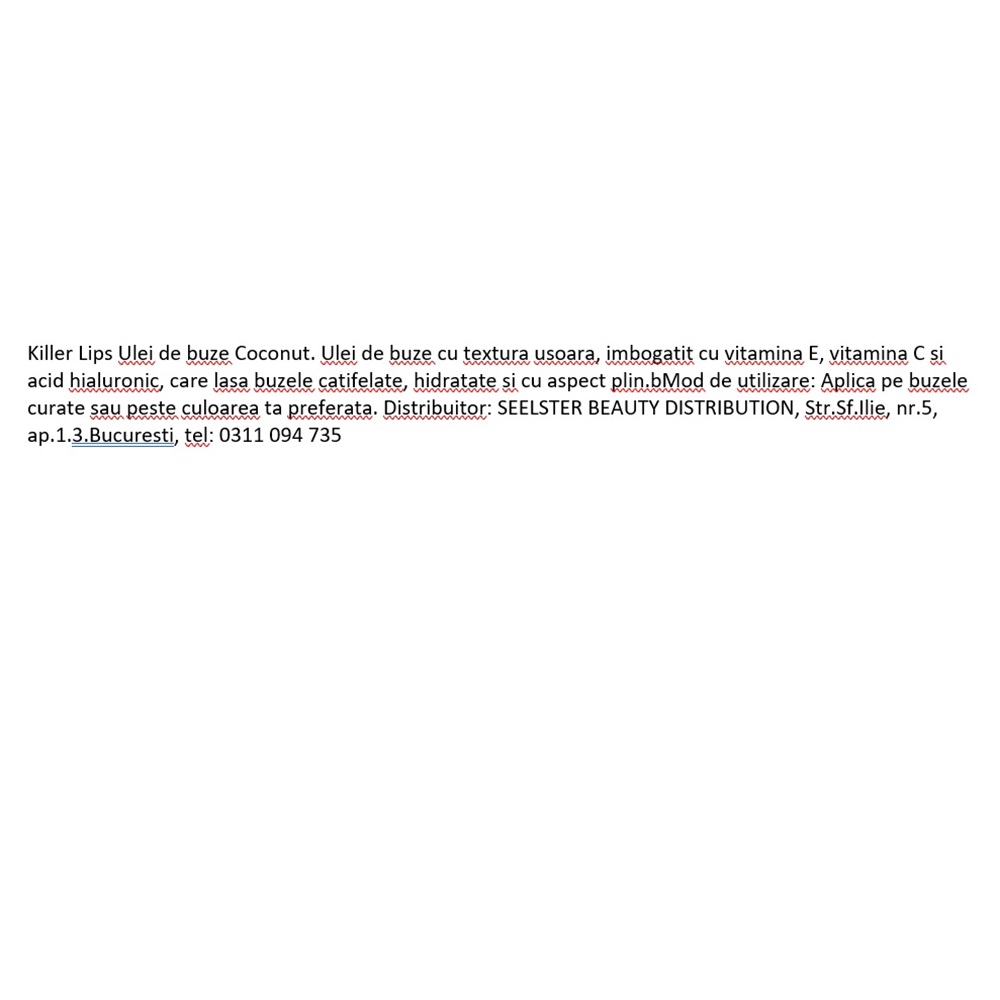 Farmacia Tei intelege importanta informatiilor prezentate in aceasta pagina si face eforturi permanente pentru a le pastra actualizate. Singura situatie in care informatiile prezentate despre Ulei de buze cu vitamina E, vitamina C si acid hialuronic Coconut Lip Oil, 3.8 ml, Killer Lips pot fi diferite fata de cele prezentate pe site este aceea in care producatorul/importatorul aduce modificari specificatiilor/etichetei acestuia, fara a ne informa in prealabil. In cazul aparitiei unor diferente, prevaleaza informatia de pe etichetele produsului fizic.