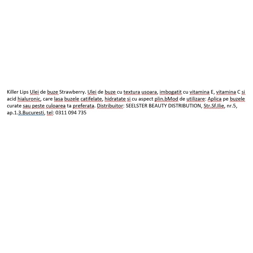 Farmacia Tei intelege importanta informatiilor prezentate in aceasta pagina si face eforturi permanente pentru a le pastra actualizate. Singura situatie in care informatiile prezentate despre Ulei de buze cu vitamina E, vitamina C si acid hialuronic Strawberry Lip Oil, 3.8 ml, Killer Lips pot fi diferite fata de cele prezentate pe site este aceea in care producatorul/importatorul aduce modificari specificatiilor/etichetei acestuia, fara a ne informa in prealabil. In cazul aparitiei unor diferente, prevaleaza informatia de pe etichetele produsului fizic.