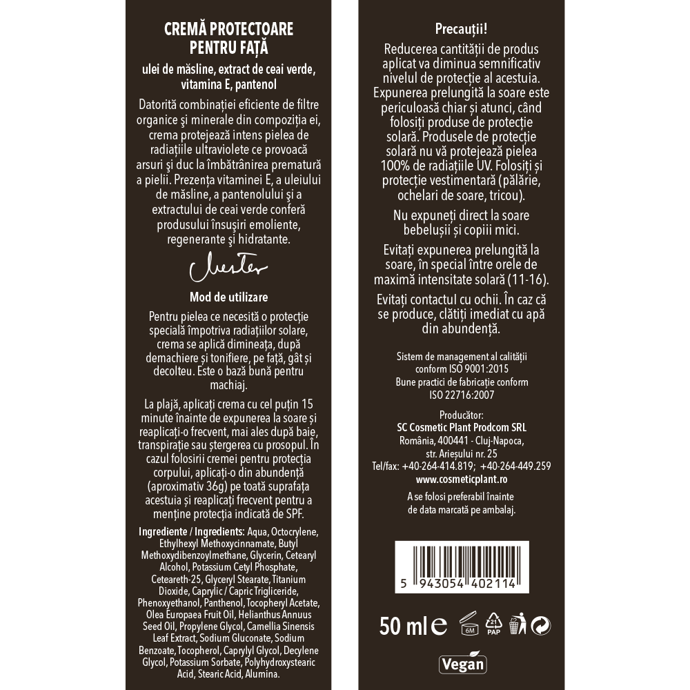 Cu o combinatie de filtre organice si minerale, crema protectoare pentru fata SPF 50 cu ulei de masline, extracte de ceai verde, vit. E si pantenol protejeaza pielea de radiatiile ultraviolete cauzatoare de arsuri si imbatrânire prematura. Prezenta vitaminei E, a uleiului de masline, a pantenolului si a extractului de ceai verde confera produsului insusiri emoliente, regenerante si hidratante alaturi de cele intens protectoare.