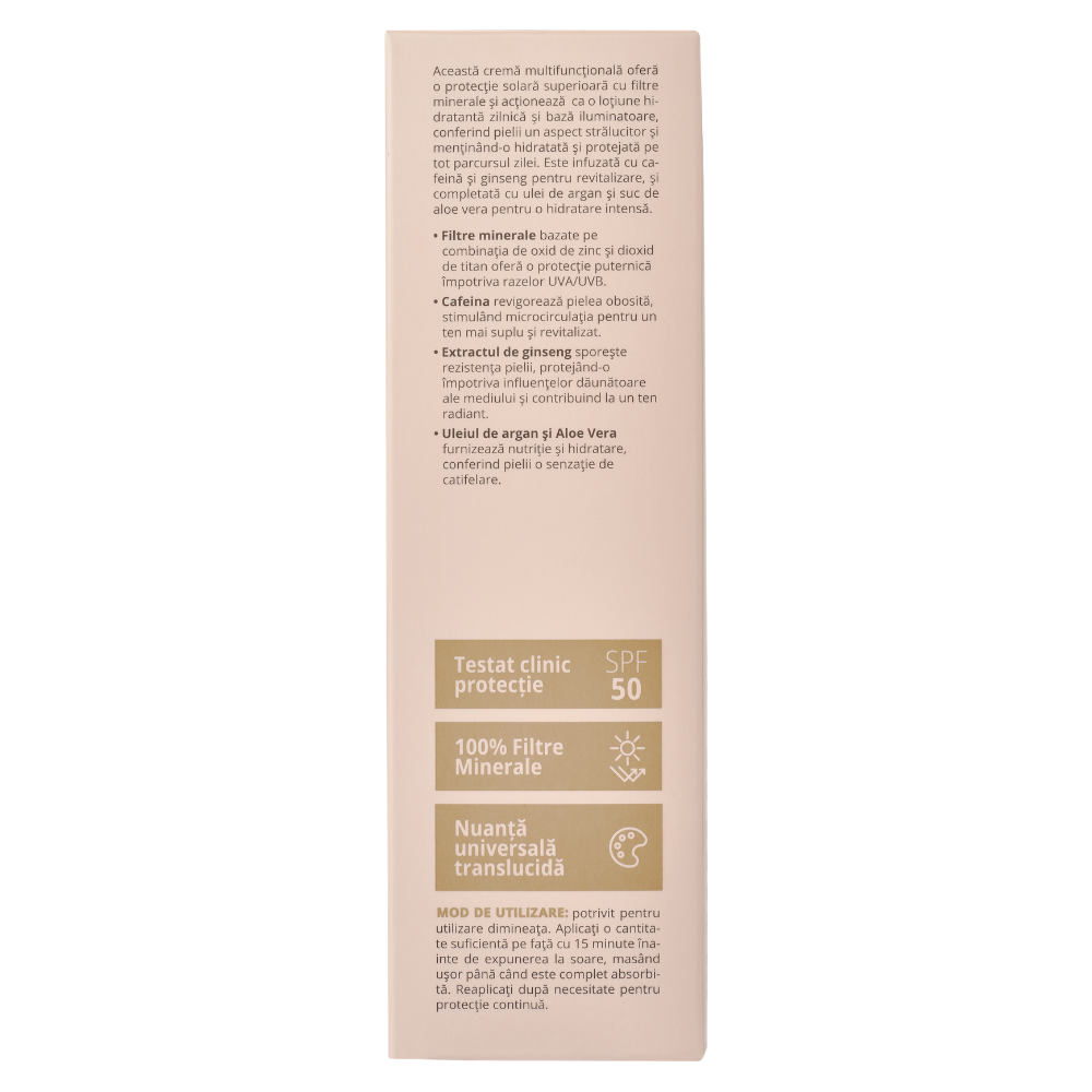 - aceasta crema multifunctionala ofera o protectie solara superioara cu filtre minerale si actioneaza ca o lotiune hidratanta zilnica si baza iluminatoare, conferind pielii un aspect stralucitor si mentinand-o hidratata si protejata pe tot parcursul zilei;