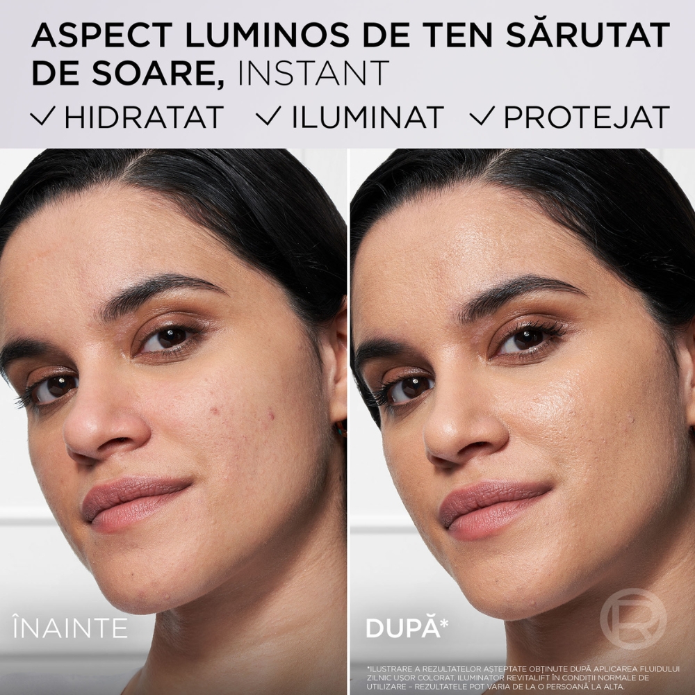- protejeaza tenul si ii da un plus de luminozitate in acelasi timp, toate acestea intr-un format practic, potrivit pentru aplicarea din mers;