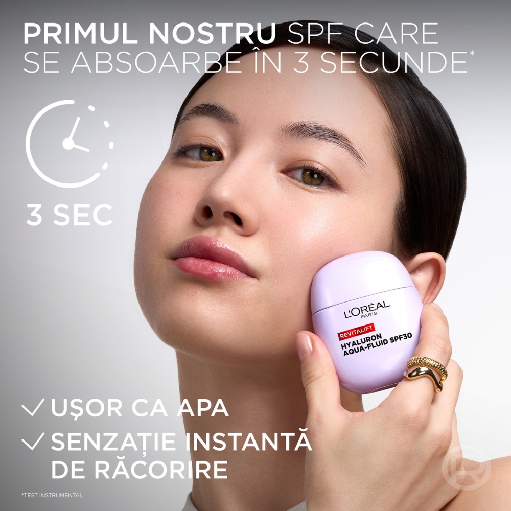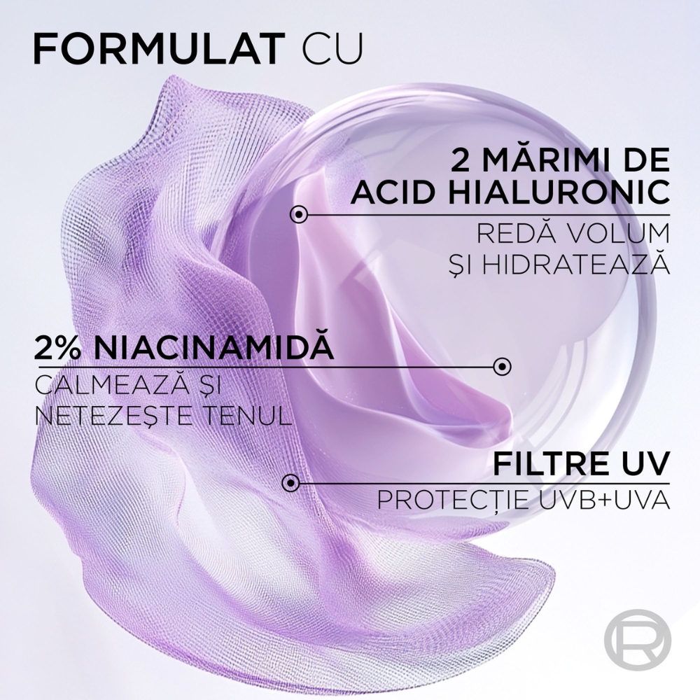 Ingrediente active:Acid Hialuronic Macro si Micro Molecular - doua dimensiuni de Acid Hialuronic care asigura patrunderea ingredientului la mai multe niveluri ale tenului si eficacitate in reumplerea lui.