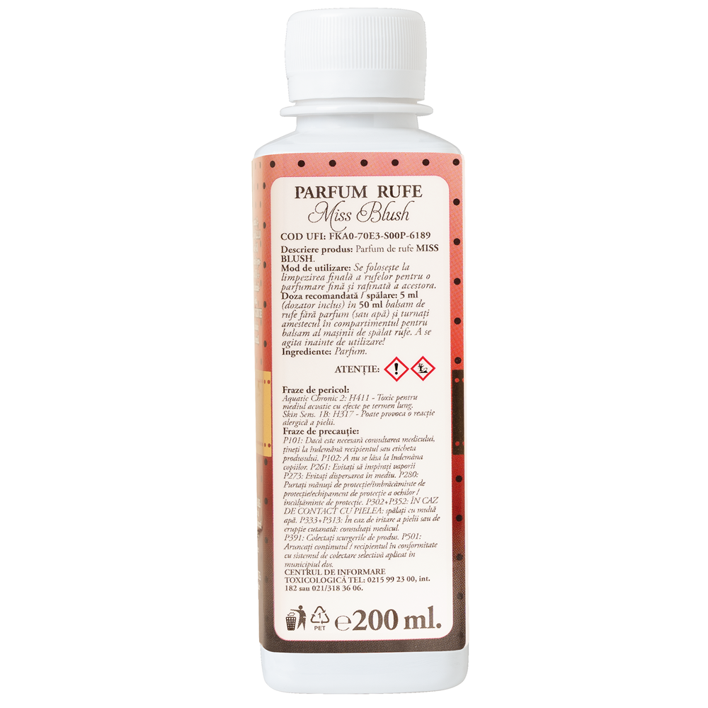 Pentru utilizare, se amesteca 5 ml parfum de rufe cu 50 ml balsam fara parfum sau cu apa.