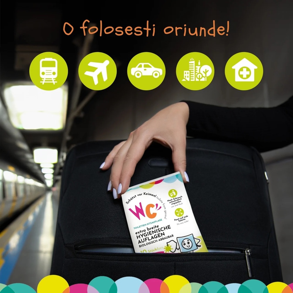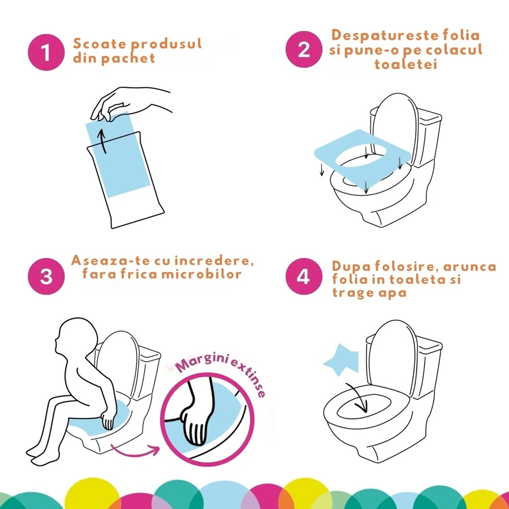 - sunt protectii igienice de unica folosinta, concepute pentru a oferi o bariera eficienta intre utilizator si suprafata toaletei publice;