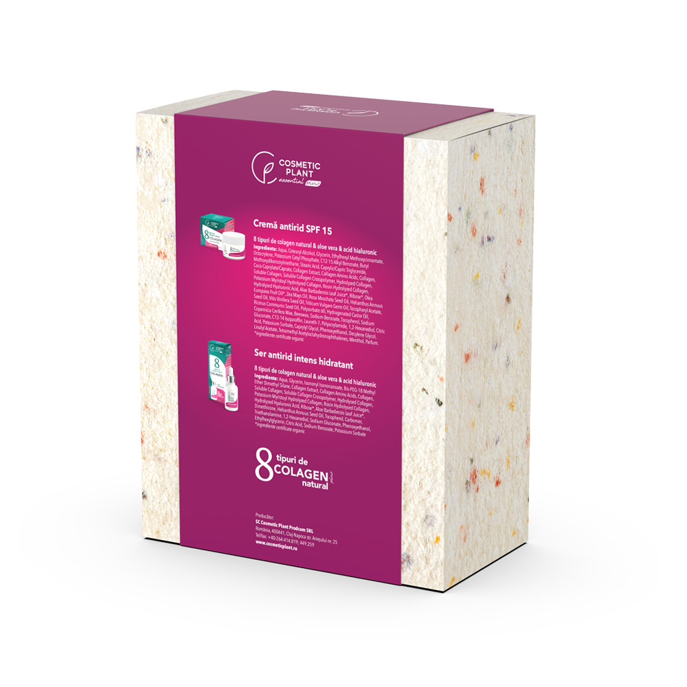 - complex cu 8 tipuri de colagen natural, acid hialuronic, gel de aloe vera, riboza asigura un efect antirid, de hidratare si protectie SPF.