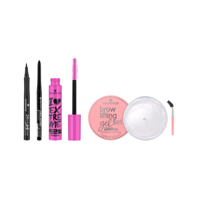 Crește volumul, definește-ți linia genelor și ridică-ți sprâncenele cu essence I Love Extreme eye set 01 Wing It! Acest kit complet include patru elemente esențiale: Mascara Crazy Volume I Love Extreme pentru gene îndrăznețe, Creion pentru ochi black fever 01 Long-Lasting pentru o definiție fină, Tus de ochi carioca 01 Intense Black 24Ever Ink Liner pentru aripioare precise și Set pentru stilizarea sprancenelor Brow Lifting Gel Set pentru a modela și a fixa sprâncenele. Acest set include tot ceea ce aveți nevoie pentru a crea stiluri atrăgătoare, indiferent dacă doriți un aspect natural de zi cu zi sau ceva mai dramatic.
