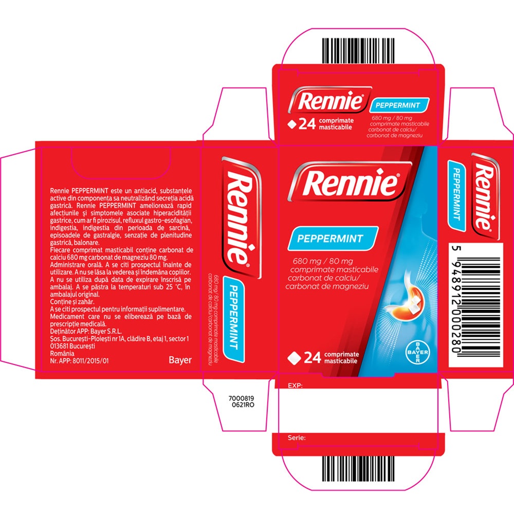 Rennie Peppermint este un antiacid, substanţele active din componenţa sa neutralizând secreţia acidă gastrică. Rennie Peppermintameliorează rapid afecţiunile şi simptomele asociate hiperacidităţii gastrice, cum ar fi pirozisul, refluxul gastro-esofagian, indigestia, indigestia din perioada de sarcină, episoadele de gastralgie, senzaţie de plenitudine gastrică, balonare.