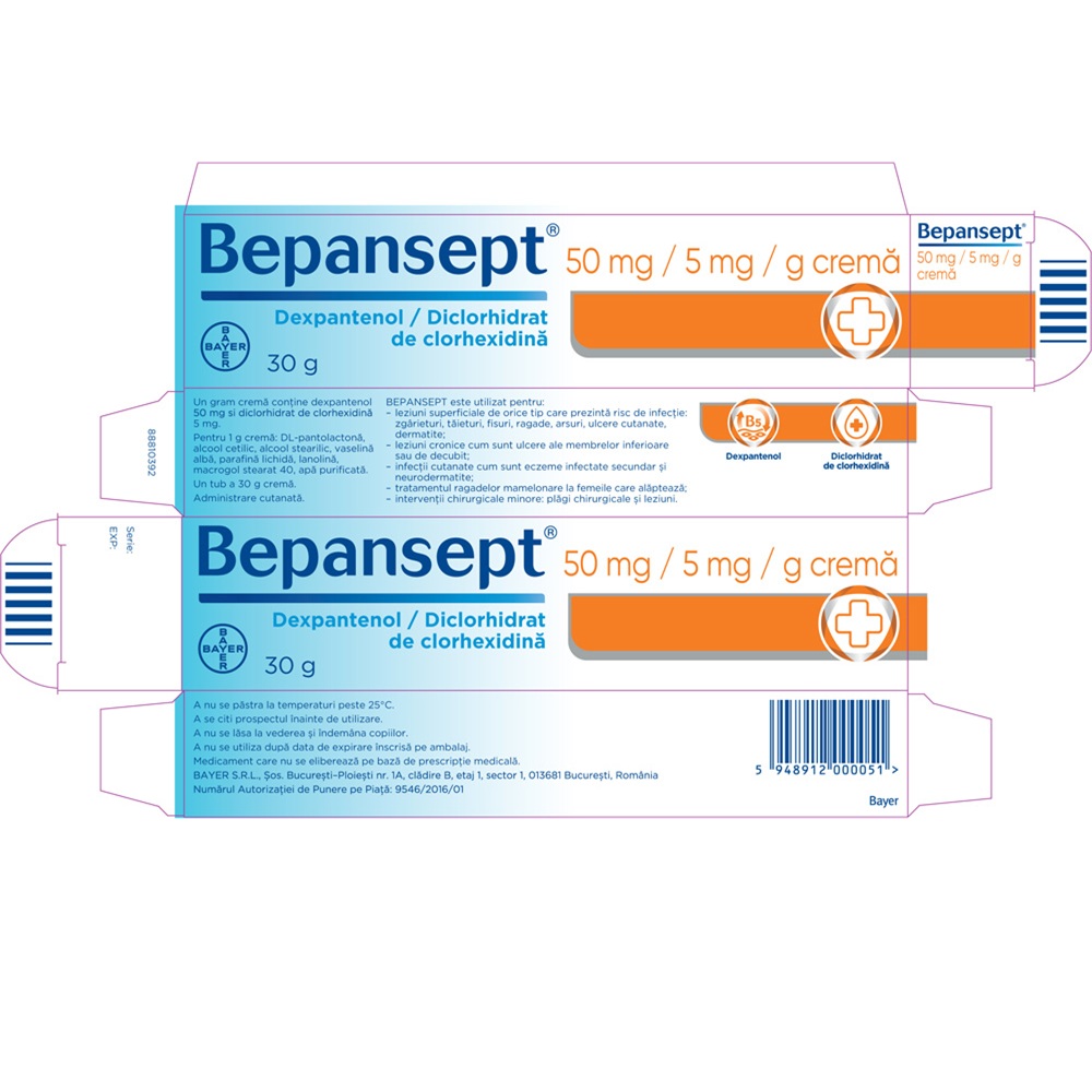 Bepansept conţine ca şi substanţe active dexpantenol şi clorhexidină. Dexpantenolul este transformat rapid de celulele dermice în acid pantotenic care are un rol important în formarea şi regenerarea pielii.