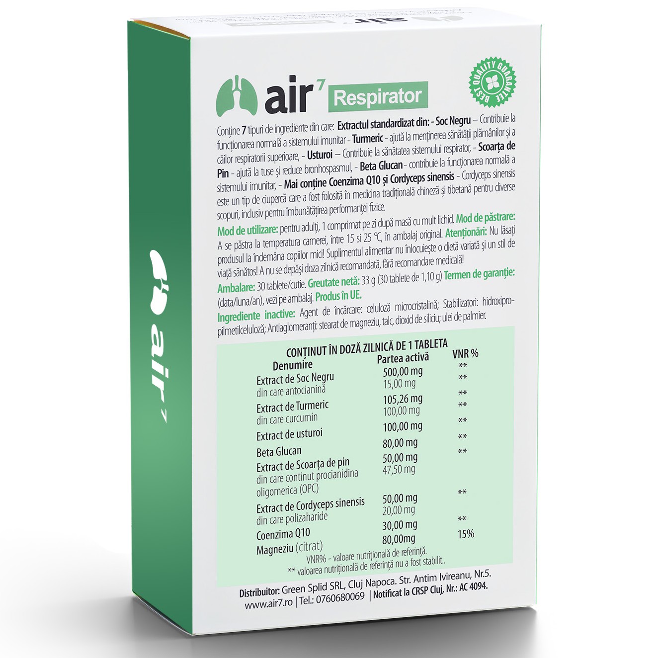 - conține 7 tipuri de ingrediente naturale, extract standardizat deș Fructe de Soc Negru, Turmeric, Usturoi, Scoarta de Pin, Cordyceps sinensis, Beta-Glucan și Coenzima Q10, care pot contribui la menținerea sănătății căilor respiratorii.