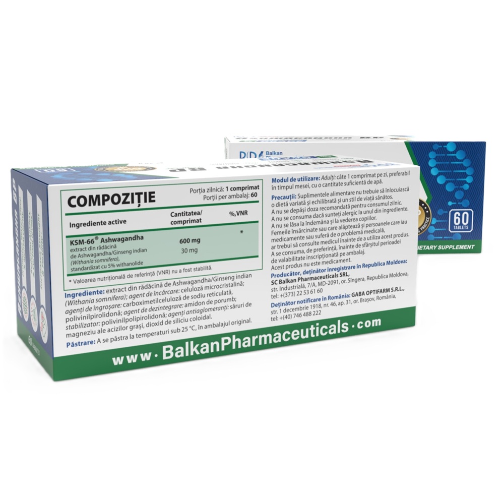Ingrediente:Extract din radacina de Ashwagandha/Ginseng indian (Withania somnifera); agent de incarcare: celuloza microcristalina; agenti de ingrosare: carboximetilceluloza de sodiu reticulata, polivinilpirolidona; agent de dezintegrare: amidon de porumb; stabilizator: polivinilpolipirolidona; agenti antiaglomeranti: saruri de magneziu ale acizilor grasi, dioxid de siliciu coloidal.