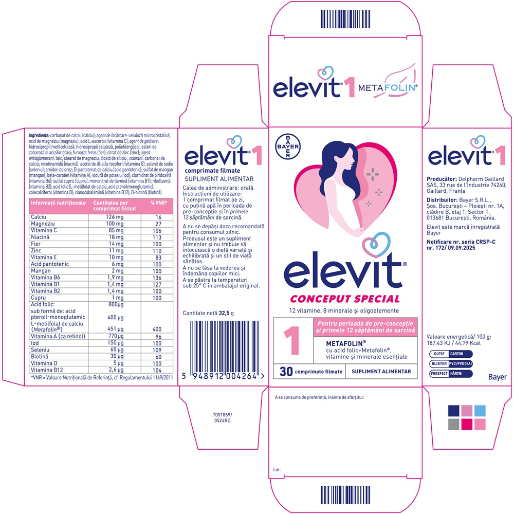 Un comprimat filmat conţine: Vitamina A-770 µg; Vitamina B1 (tiamina)-1,4 mg; Vitamina B2 (riboflavina)-1,4 mg; Vitamina B3 (niacina)-18 mg; Vitamina B5 (acid pantotenic)-6 mg; Vitamina B6 (clorhidat de piridoxina)-1,9 mg; Vitamina B7 (biotina)-30 µg; Vitamina B12 (ciancobalamina)-2,6 µg; Vitamina C-85 mg; Vitamina D-5 µg; Vitamina E-10 mg; Acid folic-800 µg, sub forma de: Acid pteroil – monoglutamic 400 µg si Metafolin®* (L-metilfolat de calciu) 451 µg (echivalent cu 400 µg acid folic); Calciu-125 mg; Magneziu-100 mg; Fier -14 mg; Zinc-11 mg; Mangan-2 mg; Cupru-1 mg; Iod-150 µg; Seleniu-60 µg.