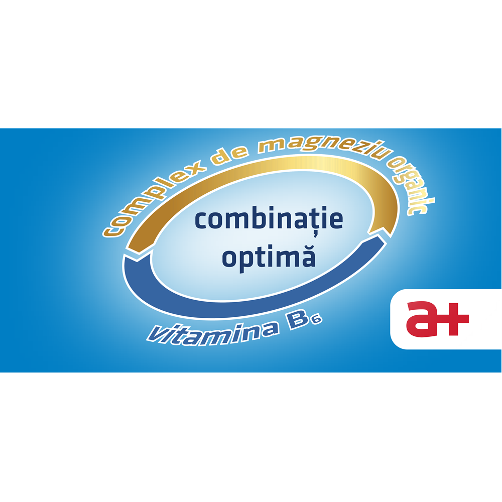 Ingrediente:Substante active: magneziu si vitamina B6. Un comprimat filmat contine 110 mg de magneziu elemental (din malat de magneziu trihidrat si bisglicinat de magneziu) si 2,5 mg de clorhidrat de piridoxina (vitamina B6).