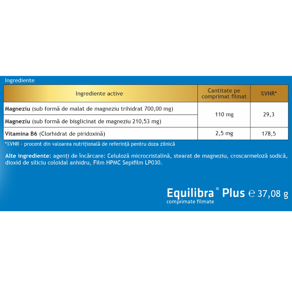 - Equilibra® Plus este o formulă concentrată, cu absorbție ridicată, bazată pe acțiunea sinergică a complexului de magneziu organic (bisglicinat de magneziu și malat de magneziu) și vitamina B6;